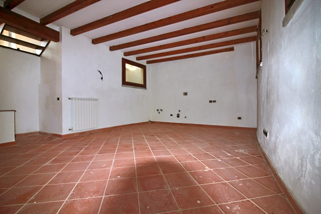 On the ground floor, there is a bright living room with exposed wooden beams, a small bedroom/study, and a bathroom;