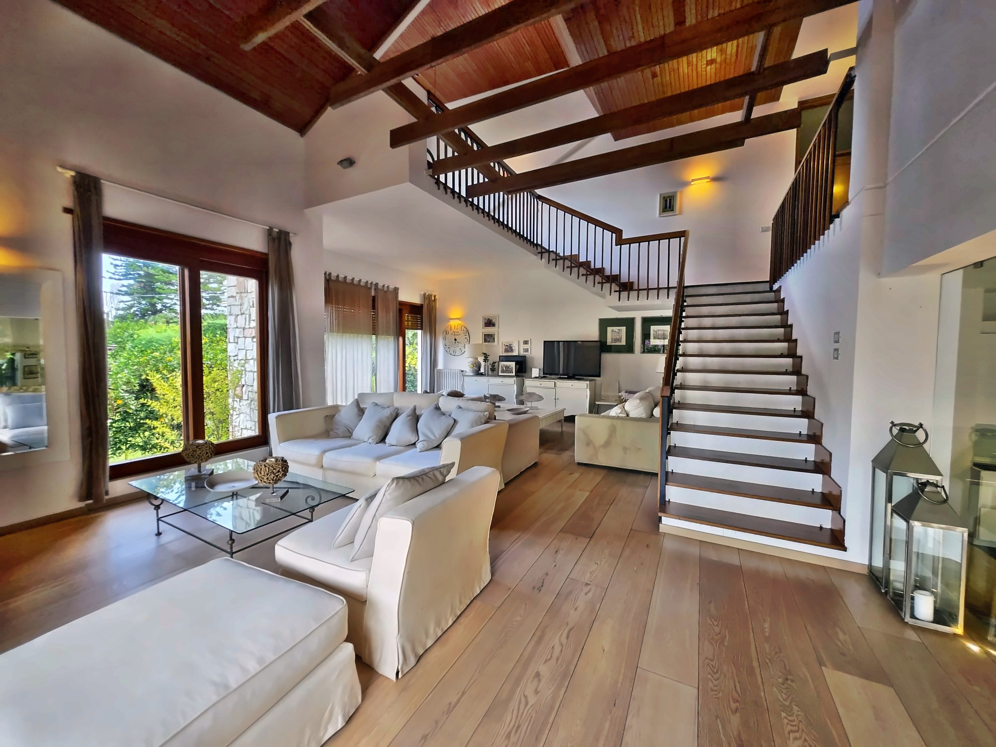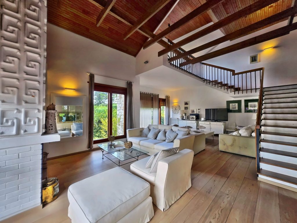 The villa opens onto an elegant double living room, bright and surrounded by large windows that create continuity with the garden. The open-plan kitchen and spacious dining area make the ground floor the convivial heart of the house, further enhanced by a double bedroom with en-suite bathroom and a second guest bedroom. A short staircase leads to a hobby room with a small lounge area, idea as a relaxation space or convertible into an additional bedroom.